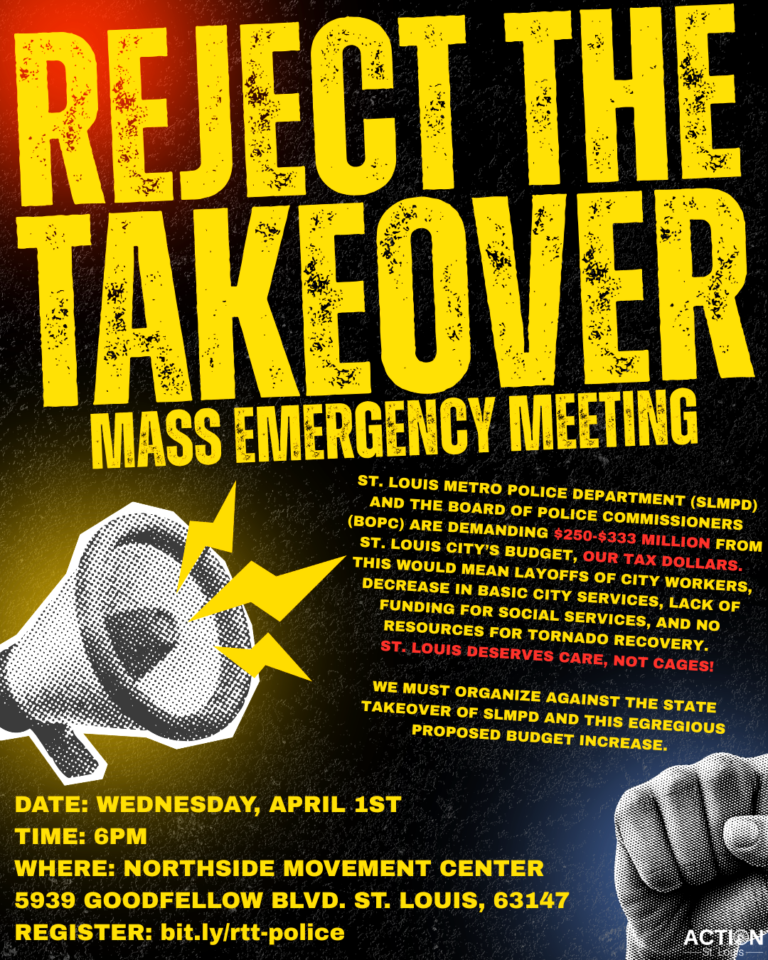 The Board of Police Commissioners is demanding $250-350 million of OUR tax dollars to fund police. St. Louisans are coming together to stop this attack and demand that St. Louis City’s budget go towards services and resources that actually help our communities–things like mental health service expansion, Right to Counsel, and funding for a just recovery in North City.