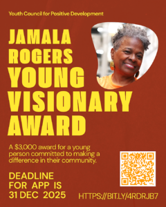 Support the Youth Council Application deadline ends December 31, 2025 The Jamala Rogers Young Visionary Award is open to all young people, regardlessof race, ethnicity,